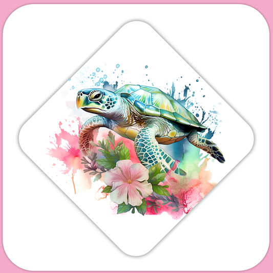 Watercolor Splash Tropical Sea Turtle Hibiscus Square Sublimation MDF Keychain